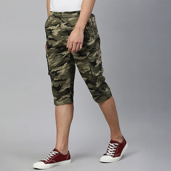 Men Olive Green & Beige Camouflage Printed Pure Cotton 3/4th Cargo Shorts