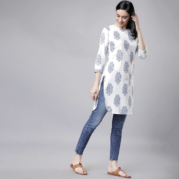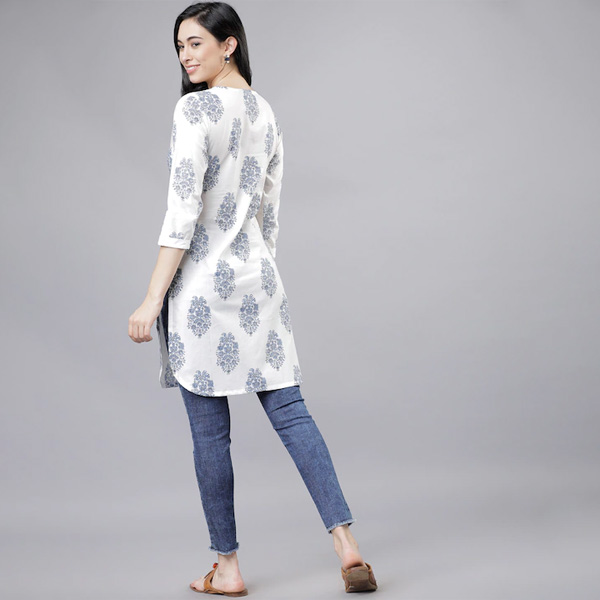 White and blue printed tunic, has a round neck, three-quarter sleeves, curved hem