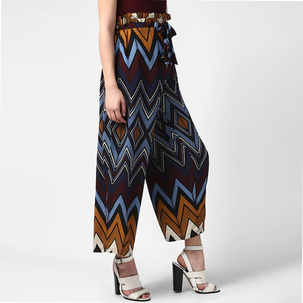 A pair of Navy Blue and mustard yellow printed woven flared fit palazzos, opaque, and drawstring closure
