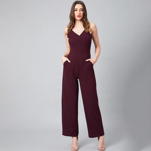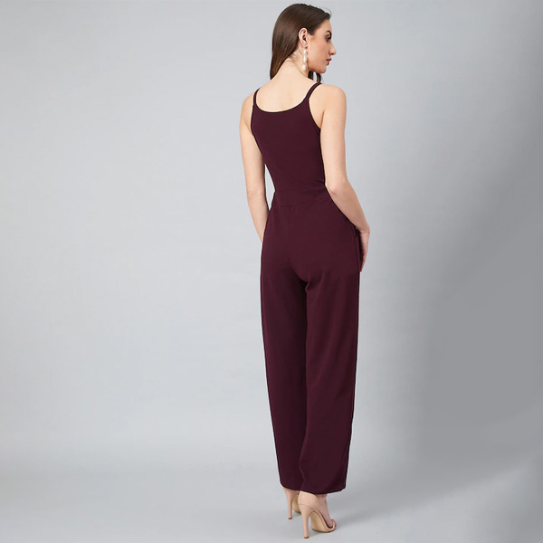Burgundy solid basic jumpsuit, has a shoulder straps, sleeveless